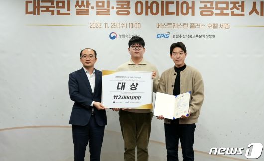 충북대학교는 농업경제학과 신민규(2학년)·한국인(4학년) 학생이 농림축산식품부가 주최한 ‘대국민 쌀·밀·콩 소비 아이디어 공모전’에서 대상을 받았다. 왼쪽부터 농림축산식품부 식량산업과 김보람 과장, 한국인 학생, 신민규 학생.(충북대 제공)/뉴스1 |