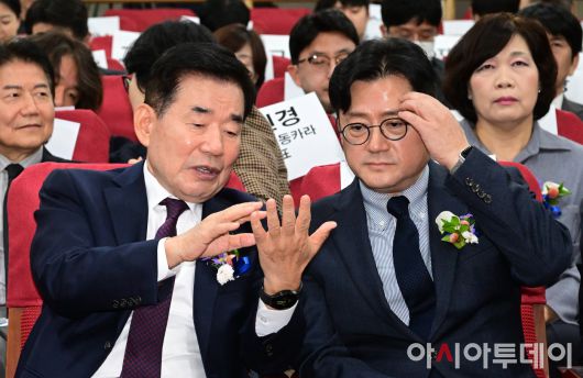 아시아투데이 이병화 기자 = 김진표 국회의장과 홍익표 더불어민주당 원내대표가 6일 국회 의원회관에서 열린 제5회 대한민국 동물복지대상에서 대화를 나누고 있다. ⓒ "젊은 파워, 모바일 넘버원 아시아투데이"