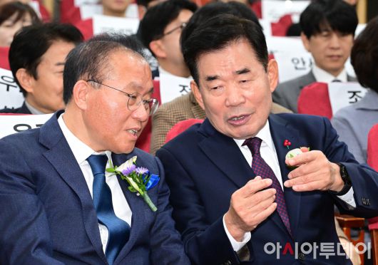아시아투데이 이병화 기자 = 김진표 국회의장과 윤재옥 국민의힘 원내대표가 6일 국회 의원회관에서 열린 제5회 대한민국 동물복지대상에서 대화를 나누고 있다. ⓒ "젊은 파워, 모바일 넘버원 아시아투데이"