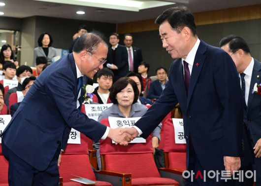 아시아투데이 이병화 기자 = 김진표 국회의장과 윤재옥 국민의힘 원내대표가 6일 국회 의원회관에서 열린 제5회 대한민국 동물복지대상에서 인사를 나누고 있다. ⓒ "젊은 파워, 모바일 넘버원 아시아투데이"