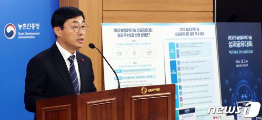 (세종=뉴스1) 김기남 기자 = 윤종철 농촌진흥청 차장이 6일 오전 세종시 정부세종청사 농림축산식품부에서 '2023 농업과학기술 성과공유대회' 내용을 발표하고 있다. 오는 7일 서울 양재동 aT센터에서 '혁신기술로 여는 농업의 미래'를 주제로 열리는 2023년 농업과학기술 성과공유대회는 우수성과 발표, 토론회 등 농업인, 소비자, 기업체가 함께 소통하는 국민과 함께하는 행사가 될 것이라고 밝혔다. 2023.12.6/뉴스1