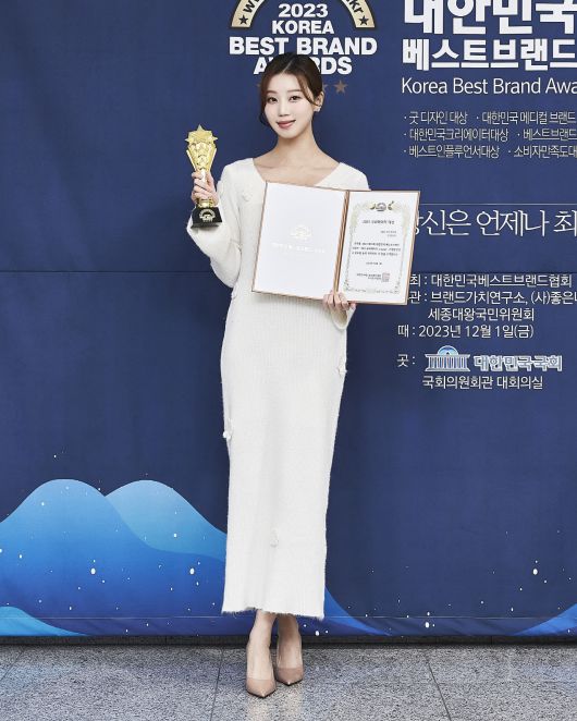 이에 수상을 한 2023 미스코리아 선 정규리가 기념촬영을 하고 있다.