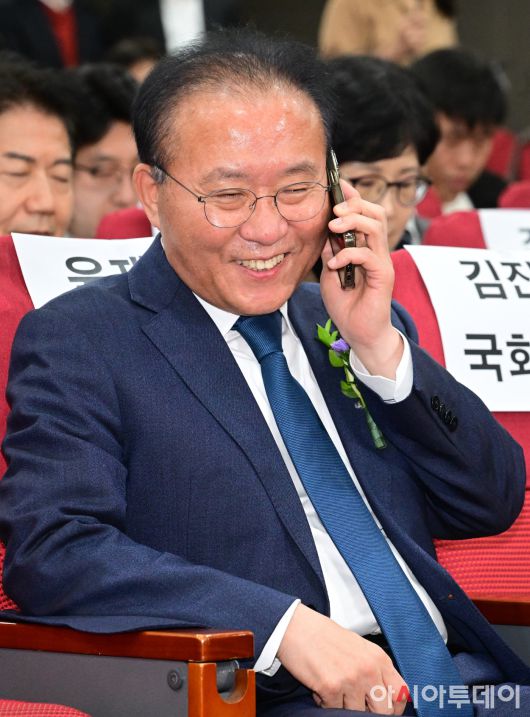 [포토] 밝은 표정으로 통화하는 윤재옥 원내대표