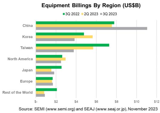 그나마 국가별로보면 중국이 전년보다 42%, 전분기보다 46%나 많은 매출로 적극적인 투자를 단행한 것으로 나타났다. 14나노 이하 '머추어 노드' 공정 투자를 늘린 영향이라고 SEMI는 설명했다.