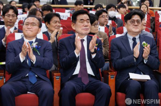 [서울=뉴스핌] 윤창빈 기자 = 윤재옥 국민의힘 원내대표(왼쪽부터), 김진표 국회의장, 홍익표 더불어민주당 원내대표가 6일 오전 서울 여의도 국회 의원회관에서 열린 2023 제5회 대한민국 동물복지대상 시상식에서 박수를 치고 있다. 2023.12.06 pangbin@newspim.com 저작권자(c) 글로벌리더의 지름길 종합뉴스통신사 뉴스핌(Newspim), 무단 전재-재배포 금지