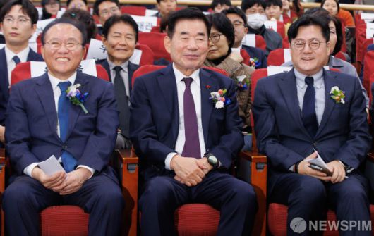 [서울=뉴스핌] 윤창빈 기자 = 윤재옥 국민의힘 원내대표(왼쪽부터), 김진표 국회의장, 홍익표 더불어민주당 원내대표가 6일 오전 서울 여의도 국회 의원회관에서 열린 2023 제5회 대한민국 동물복지대상 시상식에 자리하고 있다. 2023.12.06 pangbin@newspim.com 저작권자(c) 글로벌리더의 지름길 종합뉴스통신사 뉴스핌(Newspim), 무단 전재-재배포 금지