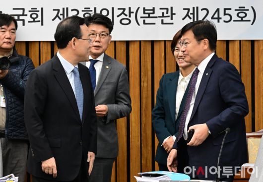 아시아투데이 이병화 기자 = 주호영 대법원장 인사청문특별위원장이 6일 국회에서 열린 조희대 대법원장 후보자 인사청문회에서 정점식-진성준 여야 간사 등과 대화를 나누고 있다.