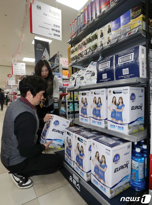 (서울=뉴스1) 박세연 기자 = 6일 서울 송파구 롯데마트 월드타워점에서 직원이 요소수를 진열하고 있다. 중국 통관이 한국에 대한 차량용 요소 수출을 지연시키는 가운데 비료 원료인 요소의 주요 수출국인 중국이 내년도 수출량을 올해 대비 70% 이상 줄이고, 또 내년 1분기까지 수출을 전면 제한하기로 한 것으로 전해져 수급 불안이 커지고 있다. 2023.12.6/뉴스1