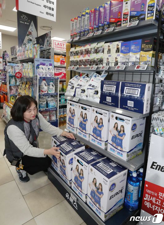 (서울=뉴스1) 박세연 기자 = 6일 서울 송파구 롯데마트 월드타워점에서 직원이 요소수를 진열하고 있다. 중국 통관이 한국에 대한 차량용 요소 수출을 지연시키는 가운데 비료 원료인 요소의 주요 수출국인 중국이 내년도 수출량을 올해 대비 70% 이상 줄이고, 또 내년 1분기까지 수출을 전면 제한하기로 한 것으로 전해져 수급 불안이 커지고 있다. 2023.12.6/뉴스1