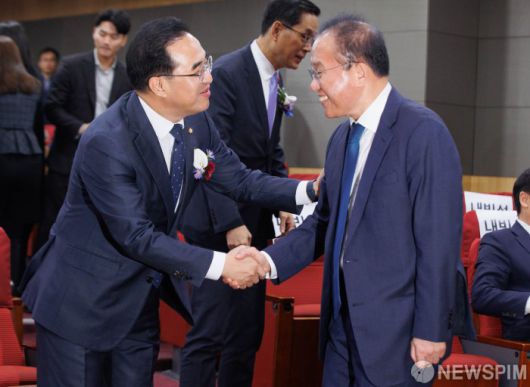 [서울=뉴스핌] 윤창빈 기자 = 윤재옥 국민의힘 원내대표, 박홍근 더불어민주당 전 원내대표가 6일 오전 서울 여의도 국회 의원회관에서 열린 2023 제5회 대한민국 동물복지대상 시상식에서 악수를 하고 있다. 2023.12.06 pangbin@newspim.com 저작권자(c) 글로벌리더의 지름길 종합뉴스통신사 뉴스핌(Newspim), 무단 전재-재배포 금지