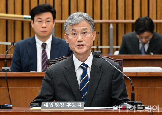 아시아투데이 이병화 기자 = 조희대 대법원장 후보자가 6일 국회에서 열린 인사청문회에서 의원들의 질의에 답변하고 있다.