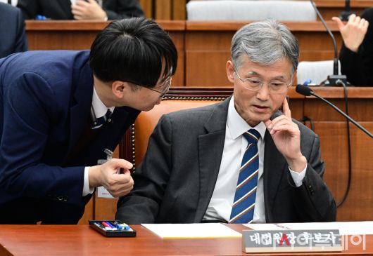 아시아투데이 이병화 기자 = 조희대 대법원장 후보자가 6일 국회에서 열린 인사청문회에서 관계자와 대화를 나누고 있다.
