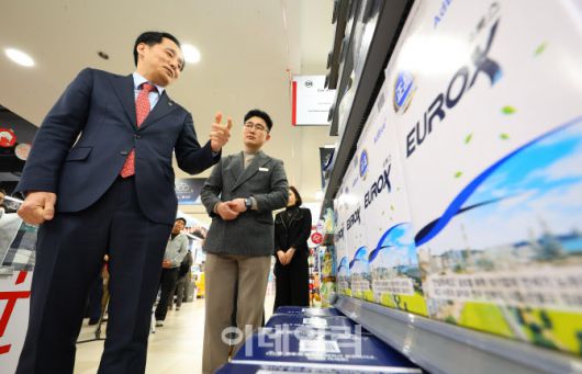 [이데일리 김태형 기자] 장영진 산업통상자원부 제1차관이 6일 서울 신천동 롯데마트 월드타워점에서 요소수 재고 및 판매 상황을 체크하고 있다. 장영진 차관은 "국내 재고 및 중국외 계약물량으로 3개월분 이상을 확보하고 있다며 충분히 유연하게 대응할 수 있는 상황"이라고 밝혔다.