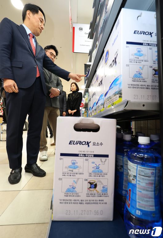 (서울=뉴스1) 박세연 기자 = 장영진 산업통상자원부 제1차관이 6일 오후 서울 송파구 롯데마트 월드타워점에서 요소수 수급 현장 점검을 하고 있다. (공동취재) 2023.12.6/뉴스1