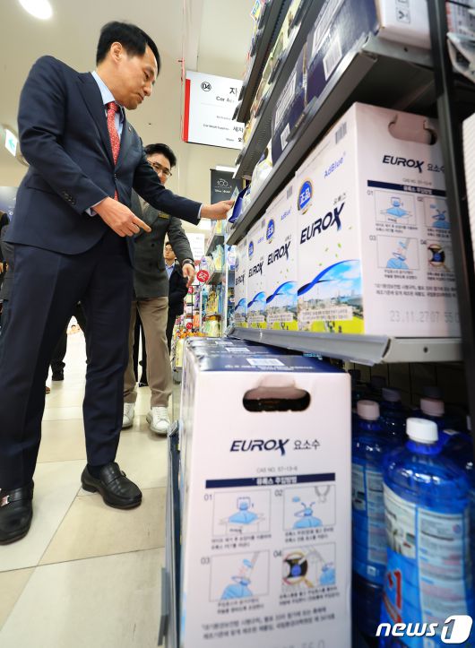 (서울=뉴스1) 박세연 기자 = 장영진 산업통상자원부 제1차관이 6일 오후 서울 송파구 롯데마트 월드타워점에서 요소수 수급 현장 점검을 하고 있다. (공동취재) 2023.12.6/뉴스1