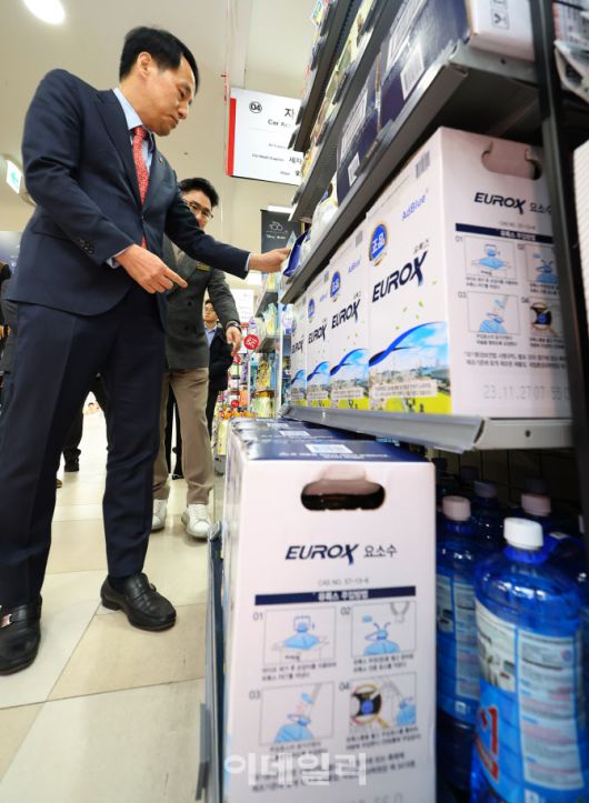 [이데일리 김태형 기자] 장영진(왼쪽) 산업통상자원부 제1차관이 6일 서울 신천동 롯데마트 월드타워점에서 요소수 재고 및 판매 상황을 체크하고 있다. 장영진 차관은 "국내 재고 및 중국외 계약물량으로 3개월분 이상을 확보하고 있다며 충분히 유연하게 대응할 수 있는 상황"이라고 밝혔다.