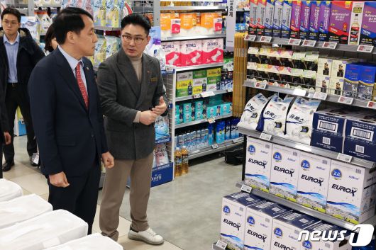 (서울=뉴스1) 박세연 기자 = 장영진 산업통상자원부 제1차관이 6일 오후 서울 송파구 롯데마트 월드타워점에서 요소수 수급 현장 점검을 하고 있다. (공동취재) 2023.12.6/뉴스1