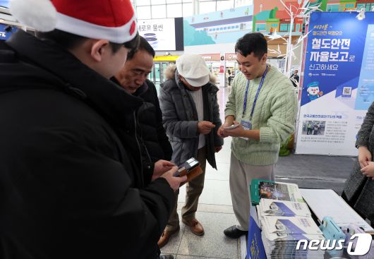 (서울=뉴스1) 김진환 기자 = 6일 오후 서울 중구 서울역 대합실에서 한 시민이 ‘2023년 철도안전 자율보고 전시회’를 찾아 QR코드를 이용한 온라인 신고 접수를 안내 받고 있다. 자율보고제도는 전 국민이 철도안전의 모든 위험요인을 자발적으로 신고하는 제도로 신고 대상은 철도안전을 저해할 수 있는 차량, 시설물, 제도 등 모든 분야의 위험이다. 철도안전정보관리시스템을 통해 신고가 가능하다. 2023.12.6/뉴스1