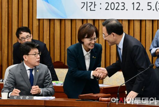 아시아투데이 이병화 기자 = 주호영 대법원장 인사청문특별위원장이 6일 국회에서 열린 조희대 대법원장 후보자 인사청문회에서 강은미 정의당 의원과 인사를 나누고 있다. ⓒ "젊은 파워, 모바일 넘버원 아시아투데이"