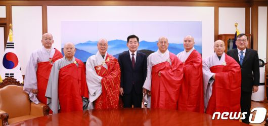 (서울=뉴스1) 임세영 기자 = 김진표 국회의장이 6일 오전 서울 여의도 국회에서 태고종 총무원장 상진스님을 접견하고 있다. 왼쪽부터 사회부장 도휘스님, 재정부원장 고담스님, 총무원장 상진스님, 김진표 국회의장, 행정부원장 능해스님, 총무부장 도성스님, 재경부장 효능스님, 조경호 의장비서실장. (국회 제공) 2023.12.6/뉴스1