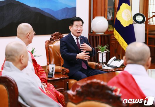 (서울=뉴스1) 임세영 기자 = 김진표 국회의장이 6일 오전 서울 여의도 국회에서 태고종 총무원장 상진스님을 접견하고 있다. (국회 제공) 2023.12.6/뉴스1