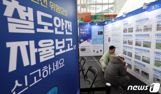 (서울=뉴스1) 김진환 기자 = 6일 오후 서울 중구 서울역 대합실에서 한 시민이 ‘2023년 철도안전 자율보고 전시회’를 둘러보고 있다. 자율보고제도는 전 국민이 철도안전의 모든 위험요인을 자발적으로 신고하는 제도로 신고 대상은 철도안전을 저해할 수 있는 차량, 시설물, 제도 등 모든 분야의 위험이다. 철도안전정보관리시스템을 통해 신고가 가능하다. 2023.12.6/뉴스1