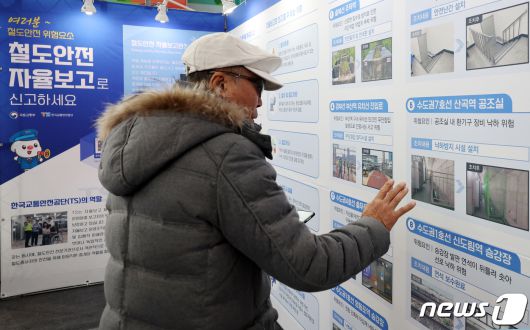 (서울=뉴스1) 김진환 기자 = 6일 오후 서울 중구 서울역 대합실에서 한 시민이 ‘2023년 철도안전 자율보고 전시회’를 둘러보고 있다. 자율보고제도는 전 국민이 철도안전의 모든 위험요인을 자발적으로 신고하는 제도로 신고 대상은 철도안전을 저해할 수 있는 차량, 시설물, 제도 등 모든 분야의 위험이다. 철도안전정보관리시스템을 통해 신고가 가능하다. 2023.12.6/뉴스1