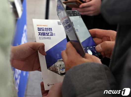 (서울=뉴스1) 김진환 기자 = 6일 오후 서울 중구 서울역 대합실에서 한 시민이 ‘2023년 철도안전 자율보고 전시회’를 찾아 QR코드를 이용한 온라인 신고 접수를 안내 받고 있다. 자율보고제도는 전 국민이 철도안전의 모든 위험요인을 자발적으로 신고하는 제도로 신고 대상은 철도안전을 저해할 수 있는 차량, 시설물, 제도 등 모든 분야의 위험이다. 철도안전정보관리시스템을 통해 신고가 가능하다. 2023.12.6/뉴스1