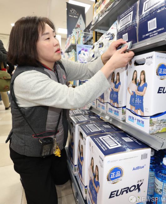 [서울=뉴스핌] 이호형 기자 = 6일 오후 서울 잠실 롯데마트 월드타워점 자동차용품 코너서 롯데마트 직원이 요소수 제품을 정리하고 있다.2023.12.06 leemario@newspim.com 저작권자(c) 글로벌리더의 지름길 종합뉴스통신사 뉴스핌(Newspim), 무단 전재-재배포 금지