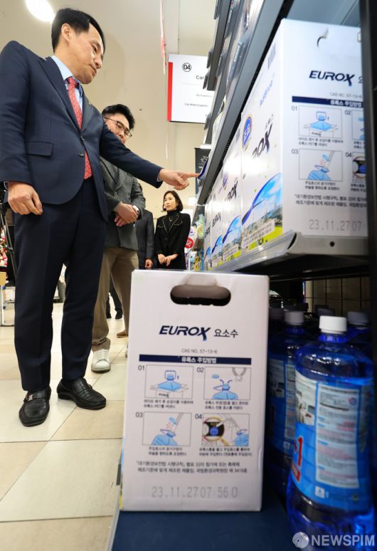[서울=뉴스핌] 이호형 기자 = 요소수 관련 현장 점검에 나선 장영진 산업통상자원부 제1차관이 6일 오후 서울 송파구 롯데마트 월드타워점에서 박석재 점장의 설명을 들으며 진열된 상품을 살펴보고 있다. 2023.12.06 leemario@newspim.com