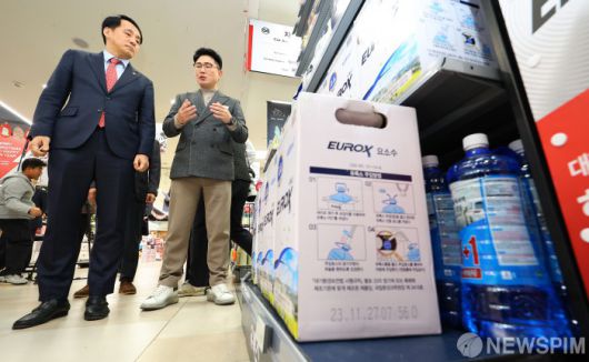 [서울=뉴스핌] 이호형 기자 = 요소수 관련 현장 점검에 나선 장영진 산업통상자원부 제1차관이 6일 오후 서울 송파구 롯데마트 월드타워점에서 박석재 점장의 설명을 들으며 진열된 상품을 살펴보고 있다. 2023.12.06 leemario@newspim.com