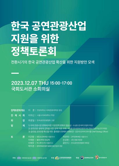 이번 정책토론회는 2021년과 지난해에 이어 3번째다. 올해 정책토론회는 실효성 있는 지원정책을 전제로 한국의 공연관광산업의 발전을 위한 전략을 도출해 내는 데 초점을 맞췄다.