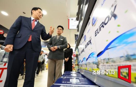 요소수 관련 현장 점검에 나선 장영진 산업통상자원부 제1차관이 6일 서울 송파구 롯데마트 월드타워점에서 박석재 점장의 설명을 들으며 진열된 상품을 살펴보고 있다. 사진=조용준 기자 jun21@