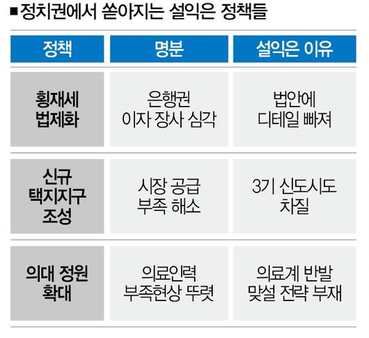 정치권이 민생을 챙기겠다며 정책을 쏟아내고 있다. 국민들은 정쟁만 일삼던 이들의 느닷없는 변화가 반갑지만, 한편으론 선거를 앞두고 있단 점에서 의도가 미심쩍다. 실제로 정책을 들여다보면 설익었거나 수단이 합리적이지 않은 경우가 많다. 여론을 설득하는 노력과 함께 정교한 정책적 고민이 필요한데도 표심을 얻겠단 이유로 마냥 밀어붙이는 중이다. 더스쿠프 視리즈 포퓰리즘의 덫 세번째 이야기 '설익음과 불통' 편이다.
