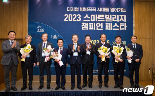 (서울=뉴스1) = 이종호 과학기술정보통신부 장관이 6일 오전 서울 중구 LW컨벤션센터에서 열린 '2023 스마트빌리지 챔피언 페스타'에서 스마트빌리지 챔피언 수상자들과 기념촬영 하고 있다. 왼쪽부터 황종성 한국지능정보사회진흥원장, 임동빈 전라북도 완주군 행복복지국 행정지원과장, 이진찬 경기도 성남시 부시장, 송재환 경기도 부천시 부시장, 이 장관, 우동기 지방시대위원회 위원장, 김재광 전라남도 신안군 부군수, 최성희 케이그린텍 연구소장, 박배욱 욱성미디어 대표. (과학기술정보통신부 제공) 2023.12.6/뉴스1