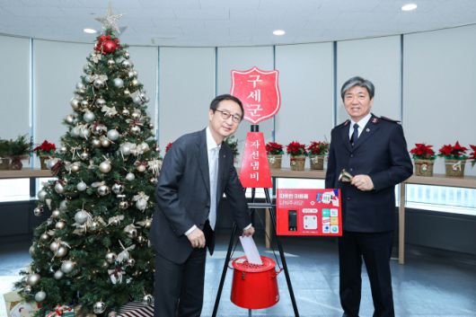 현대해상은 지난 5일 서대문구 충정로에 위치한 구세군빌딩에서 구세군 자선냄비에 성금 3억원을 전달했다. 조용일 현대해상 대표이사(왼쪽)가 구세군 자선냄비에 성금을 기부하고 있다./현대해상 |