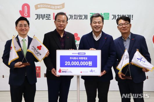[창원=뉴시스]홍정명 기자=6일 경상남도사회복지공동모금회 대회의실에서 ㈜마창대교 김성환(오른쪽 두 번째) 대표이사가 모금회 강기철 회장에게 이웃돕기 성금 2000만 원을 전달하고 있다.(사진=경남사회복지공동모금회 제공)2023.12.06. photo@newsis.com |