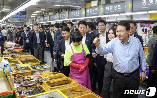 윤석열 대통령과 김건희 여사가 27일 부산 중구 자갈치시장을 찾아 수산물 시장 상황을 점검하며 상인을 격려하고 있다. 2023.7.27/뉴스1 ⓒ News1 부산사진공동취재단 |