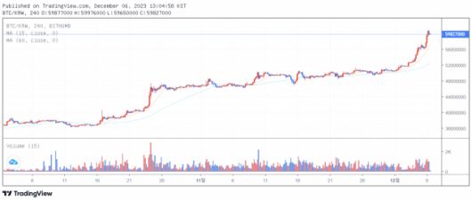 6일 오후 1시 5분 빗썸에서 국내 비트코인(BTC)은 전일 대비 3.74% 상승한 5981만 4000원에 거래 중이다. 이더리움(ETH)은 2.77% 증가한 311만 4000원이다. 바이낸스코인(BNB)은 0.44% 오른 31만 6400원, 리플(XRP)은 1.68% 상승한 849원에 거래됐다. 솔라나(SOL)는 6.05% 높아진 8만 7700원이다.