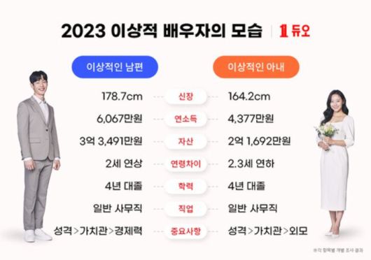 또한 이상적인 아내는 신장 164.2cm, 연 소득 4377만 원, 자산 2억 1692만 원, 2.3세 연하, 4년제 대졸, 일반 사무직 여성이었습니다.