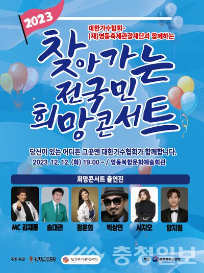 '2023 찾아가는 전 국민 희망콘서트'가 오는 12일 충북 영동군 영동읍 영동복합문화예술회관에서 열린다.