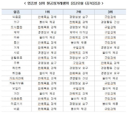 공급업자가 일방적으로 거래조건을 불합리하게 변경하거나 반품을 거부하는 등의 불이익 제공행위의 경우는 가구(17.1%), 자동차 판매(16.1%), 가전(7.5%) 업종 순으로 높게 나타났다. 또 경영상 비밀에 해당하는 정보에 대해 요구받은 경험이 있다고 응답한 업종은 보일러(15.9%), 자동차 판매(10.4%), 기계(6.4%) 업종 순으로 높게 조사됐다.