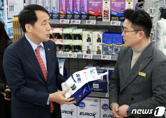 장영진 산업통상자원부 제1차관이 6일 오후 서울 송파구 롯데마트 월드타워점에서 요소수 수급 현장 점검을 하고 있다. (공동취재) 2023.12.6/뉴스1 ⓒ News1 박세연 기자 |
