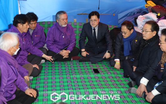 (서울=국제뉴스) 홍익표 더불어민주당 원내대표를 비롯한 의원들이 6일 서울 여의도 국회 앞 10.29 이태원 참사 유가족협의회 농성장을 찾아 유가족과 대화를 나누고 있다. /사진=원명국 기자