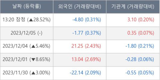 [서울=뉴스핌] 로보뉴스 = 06일 13시 30분 현재 대상홀딩스(084690)는 기관이 31,000주 대량으로 순매수(잠정) 하면서 전일 대비 28.52% (현재가 13,160원) 상승하고 있다.