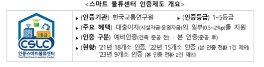 2021년 도입된 인증제도는 입고부터 출고까지 물류 과정별 첨단·자동화 수준과 건축물의 구조적 성능, 친환경성 등을 따져 등급별 인증을 받을 수 있다. 지금까지 42개 물류센터가 인증을 받았다.