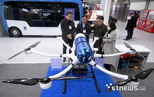 산업통상자원부가 주최하는 '2023 대한민국 산업기술 R&D대전'이 '오늘을 넘어, 내일의 대한민국을 만들어가는 K-Tech 30년'을 주제로 6일 서울 강남구 코엑스에서 사흘간 일정으로 열렸다. 하이리움산업 부스에서 관람객이 액화수소로 작동하는 수소 연료 전지 드론과 드론 이착륙, 관제, 충전이 가능한 관제스테이션에 대한 설명을 듣고 있다.