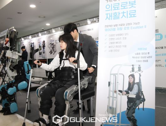 (서울=국제뉴스) 6일 서울 여의도 국회 의원회관에서 국회 혁신4.0연구포럼 주최로 열린 돌봄 및 사회적 약자를 위한 로봇 전시회에서 관계자가 웨어러블 의료로봇을 시연하고 있다. /사진=원명국 기자