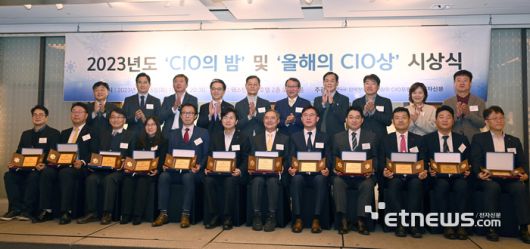 2023년 CIO의 밤 및 올해의 CIO상 시상식이 5일 서울 중구 웨스틴조선호텔에서 열렸다. 시상자와 수상자들이 단체 기념촬영 했다. 뒷줄 왼쪽부터 문정현 한국정보산업연합회 전무, 정현석 동양미래대 교수, 강병준 전자신문 대표, 김홍선 SC제일은행 부행장, 김병윤 한국CIO포럼 회장, 정진섭 한국정보산업연합회장, 유은종 한국정보산업연합회 상근부회장, 이경배 에이위즈 대표이사, 이지현 라이나원 대표이사, 이준호 한국화웨이 전무.