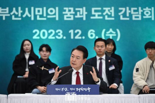 [서울=뉴스핌]윤석열 대통령이 6일 부산 동구 부산항국제전시컨벤션센터에서 열린 '부산시민의 꿈과 도전' 간담회에서 발언하고 있다. [사진=대통령실] 2023.12.06 photo@newspim.com |